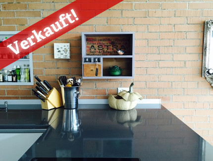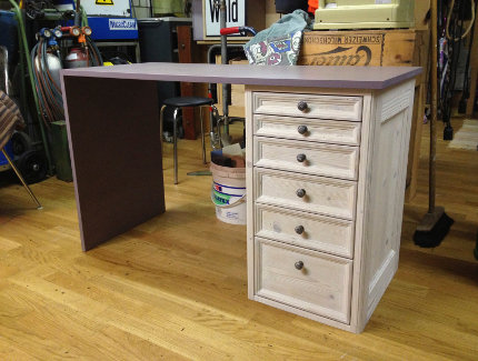 Korpuss Altholz weiss gekalkt. Arbeitsplatte MDF grau lackiert.