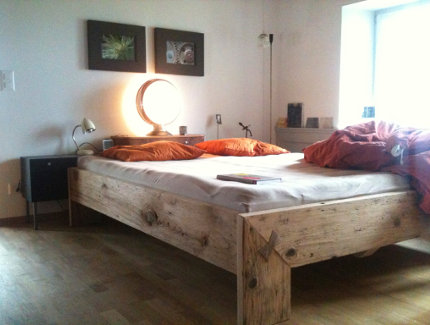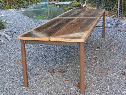 Dieser rustikale Gartentisch entstand aus einem alten Tenntor. Mit einer Länge von 3 Metern bietet er Platz für jedes Grillfest.