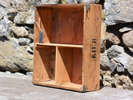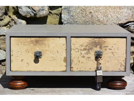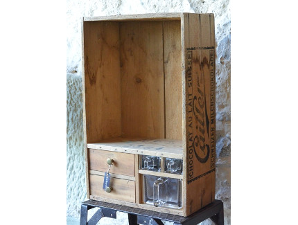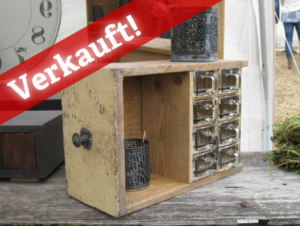 Kleine Schublade aus einem Buffet, darüber 2 Glasschütten. Rückwand aus einer Transportkiste der ASTRA Fett und Oelwerke. Grösse 47/42/20cm. Noch erhältlich.