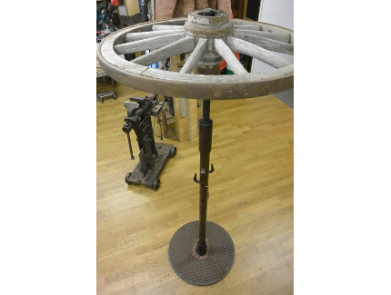 Im Auftrag des Kunden aus einem alten Wagenrad und Schachtdeckel. Höhe 175cm