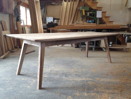Tischblatt und Unterbau massiv aus ungedämpftem, einheimischem Nussbaum. Grösse 250/95cm