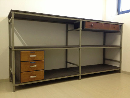 Neu interpretiert. Ausgedientes Lagerregal kombiniert mit alten Schubladen. 99% Recycling .Grösse 200/125/60cm