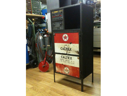 Türe aus einem originalen Caltexgebinde. Darüber 2 ausrangierte Lagerbehälter. Der Kasten ist aus schwarzem MDF und wurde mit Eisenwinkeln eingefasst. 99% Recycling. Grösse 110/60/40cm