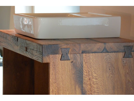 Waschtisch mit Keramik Waschbecken angefertigt aus Antik-Eiche, mit traditioneller Eckverbindung.